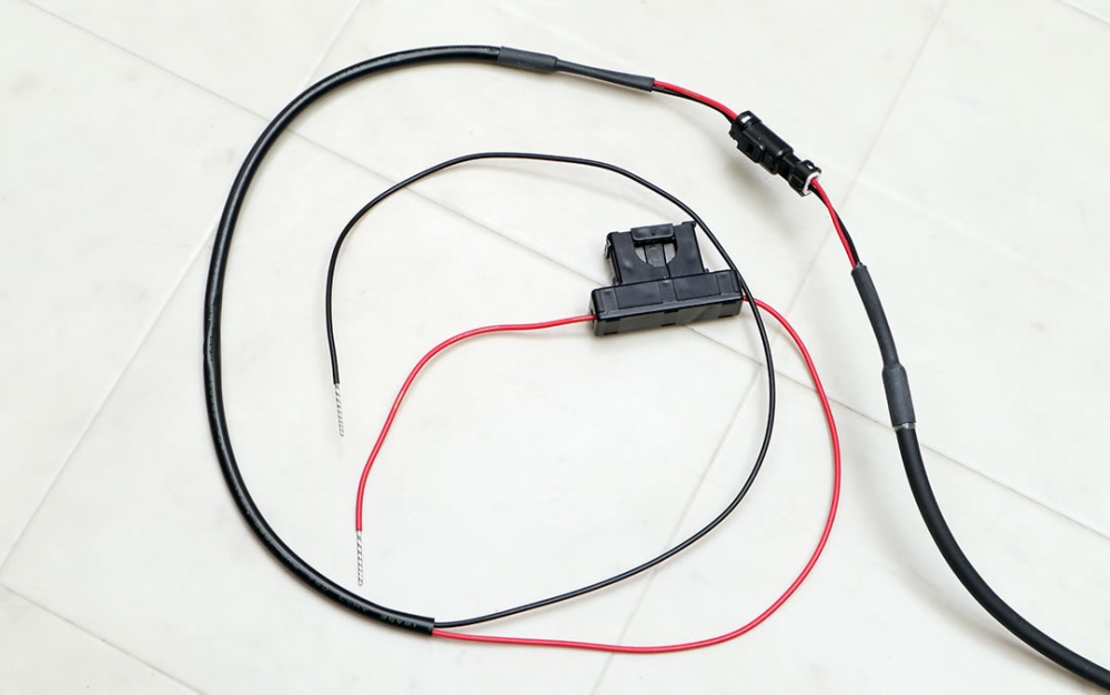 プラス側は1Aのガラス管ヒューズを介してギボシ端子が固定されていて