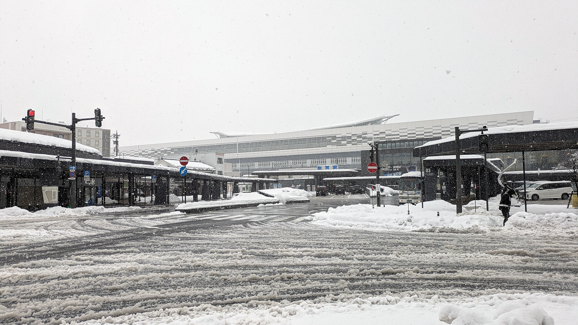 奥の高架が最近開通した北陸新幹線の駅ですね。
